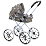 Le tissu gris de la poussette, orné d’étoiles blanches et roses contrastées, inspire les enfants à créer des scénarios imaginaires et des jeux de rôle. Cela contribue au développement des émotions, de l’imagination et de la pensée créative de l’enfant lorsqu’il endosse des rôles comme soignant ou maman.
