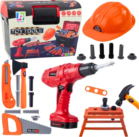 Le set d’outils pour enfants permet aux petits bricoleurs de jouer en toute sécurité avec des outils qui ressemblent à de vrais. La perceuse électrique à piles dispose d’embouts interchangeables – plat, cruciforme et foret. Le set comprend également un établi et un casque de protection pour un réalisme accru pendant le jeu.