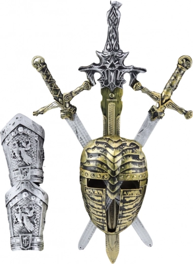 Avec ce set de chevalier, les enfants peuvent devenir de vaillants guerriers. Grâce au masque stylisé, ils obtiennent un look chevaleresque et se sentiront comme au Moyen Âge. Le set comprend trois épées de tailles différentes, un masque décoratif et deux protège-bras, qui apportent un style chevaleresque réaliste à l’ensemble.