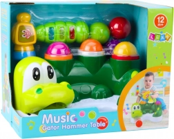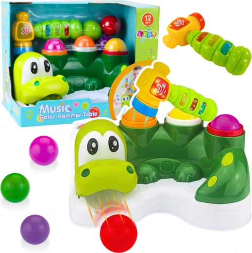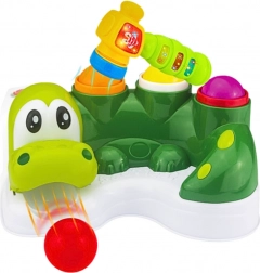 L'enfant utilise un marteau pour frapper les balles colorées, qui tombent à l'intérieur du jouet et jaillissent de la gueule mobile du crocodile, créant ainsi un toboggan amusant. Le marteau interactif s'illumine, joue des mélodies et émet d'autres sons à l'aide d'un bouton spécial avec un clown.