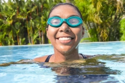 Des verres en polycarbonate résistants avec filtre UV protègent les yeux des rayons nocifs du soleil, à la piscine extérieure comme à la mer.