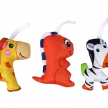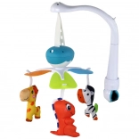 L’élément central comprend trois peluches colorées – un zèbre, une girafe et un dinosaure rouge – qui tournent lorsque le mobile est activé. Leur mouvement capte l’attention de l’enfant et encourage le suivi visuel, influençant positivement le développement de la coordination œil-main. Des couleurs intenses, des formes amicales et un tissu doux stimulent la vue, le toucher et l’imagination de l’enfant.