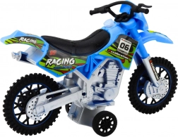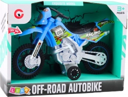 Cette moto est fabriquée en plastique résistant, qui supporte un jeu intensif. Son design bleu accrocheur avec des autocollants de course et ses grandes roues de style tout-terrain assurent une excellente stabilité et des sensations réalistes lors de la conduite sur terrain accidenté.