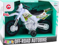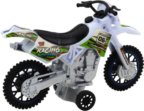 Ce modèle de motocross est fabriqué en plastique robuste qui résiste au jeu intensif. Son design blanc et vert avec des autocollants de course est très attrayant. Les grandes roues tout-terrain assurent la stabilité et une meilleure simulation de conduite sur surface irrégulière.