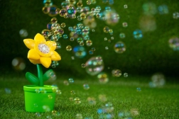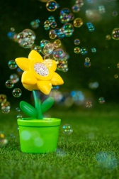 Son design en forme de fleur jaune dans un pot vert attire l’œil au premier regard et transforme chaque jeu en un spectacle joyeux plein de bulles.