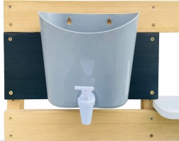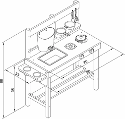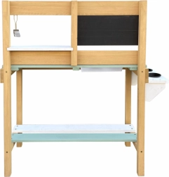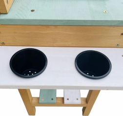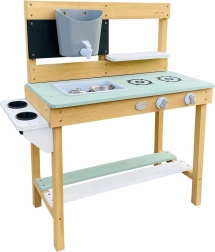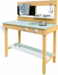 Le bois de la cuisine est traité avec une peinture écologique, sûre pour les enfants et conforme aux normes CE et EN 71. Il est fabriqué à 100 % en bois de pruche (Hemlock) certifié FSC, résistant aux intempéries et à la pourriture.