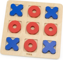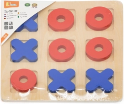 Le set comprend un plateau de jeu en bois pour le morpion et un total de neuf pièces en bois colorées : quatre « X » bleus et cinq « O » rouges.