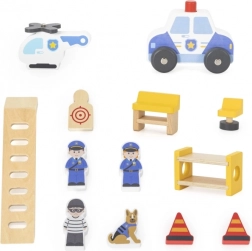 Le set inclut de nombreux accessoires : figurines de 2 policiers, d’un voleur et d’un chien policier, ainsi qu’un véhicule de police, un hélicoptère et des éléments pour organiser l’intervention. Les enfants exercent naturellement leurs compétences sociales, leur coopération, leurs capacités de coordination et développent leur imagination.
