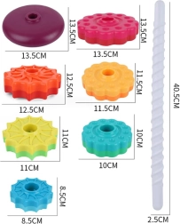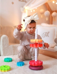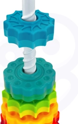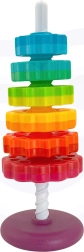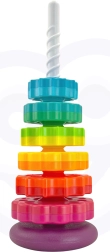 • Le set contient six disques en forme d’étoile, qui peuvent être empilés pour créer une pyramide colorée et tournante