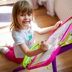 Face magnétique, face effaçable à sec et face fluorescente pour dessiner avec la lumière – les enfants choisissent ce qui les amuse et peuvent alterner les techniques sans limites.