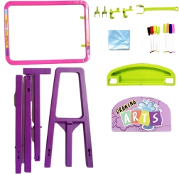 Le coffret comprend 4 feutres effaçables à sec, 4 feutres LED fluorescents, un chiffon de nettoyage et des éléments de montage. Il suffit d’assembler et de commencer à dessiner.