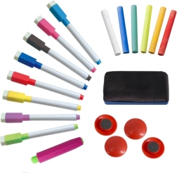 - 8 feutres à base d’eau, 6 craies de couleur, 1 éponge/chiffon, 4 aimants
