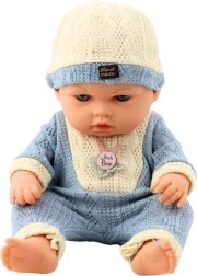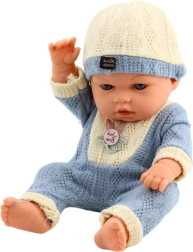 La poupée mesure environ 29 x 15 cm, ce qui la rend suffisamment grande pour faire impression, tout en restant légère et facile à manipuler – elle tient idéalement dans les petites mains et se glisse aisément dans la plupart des poussettes ou lits de poupée. Elle est vêtue d’un ensemble tricoté doux dans des tons crème clair et bleu pastel, agrémenté d’un écusson.