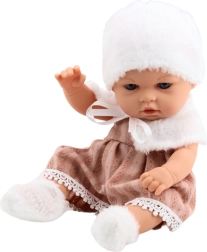 La poupée bébé porte une robe beige à texture brodée et dentelle, complétée par un col en fourrure blanche et un bonnet doux à nouer sous le menton. Des chaussettes en fourrure complètent l’ensemble et confèrent à la poupée une allure hivernale douillette.