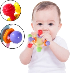 Le hochet intégré tinte doucement lors des mouvements, ce qui favorise le développement de l’ouïe et capte l’attention de l’enfant. Son format compact et ses prises adaptées aux petites mains facilitent la préhension, la rotation et la pression, entraînant ainsi la coordination et la force de la prise.