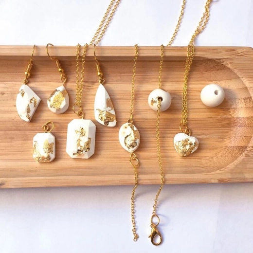 Comment faire ? Mélangez le ciment avec de l’eau selon les instructions, ajoutez dans le moule des feuilles d’or ou de cuivre, versez la préparation puis, après séchage, démoulez les pièces. Utilisez les outils fournis pour la finition et l’assemblage de vos bijoux faits main.