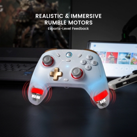 Profitez de fonctionnalités avancées avec la GameSir Cyclone 2, offrant un contrôle précis grâce aux sticks Mag-Res™ TMR sans zones mortes et aux gâchettes à effet Hall pour une réponse fiable. Le gyroscope à six axes assure un suivi fluide et les moteurs de vibration asymétriques situés dans la partie inférieure de la manette apportent des sensations réalistes en jeu.