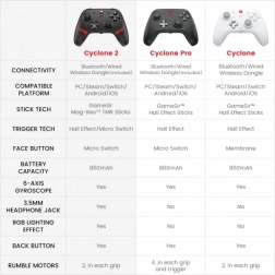 Découvrez un contrôle précis et des performances de pointe avec la manette GameSir Cyclone 2. Elle offre une connectivité triple mode (2,4 GHz, Bluetooth, filaire), des sticks Mag-Res TMR, des gâchettes analogiques à effet Hall, un gyroscope 6 axes, des vibrations immersives et un rétroéclairage RGB pour les consoles SWITCH, PC, Android et iOS.