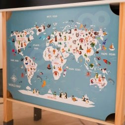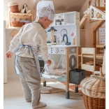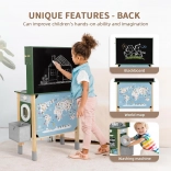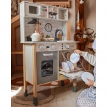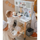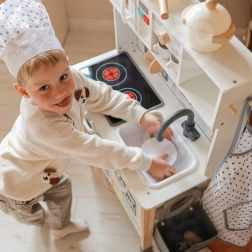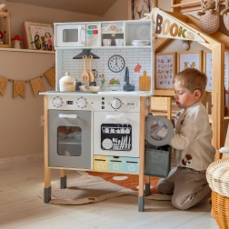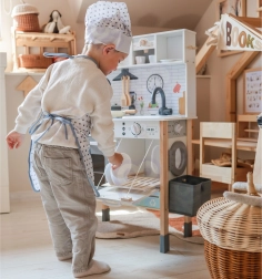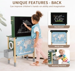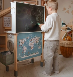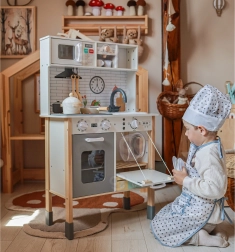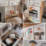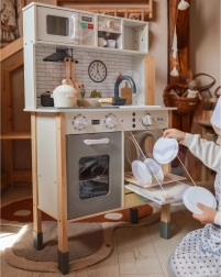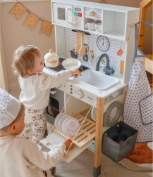Cette cuisine en bois WOOPIE GREEN est conçue pour les petits chefs et explorateurs. La partie avant propose une zone culinaire richement équipée avec une cafetière, un micro-ondes, un évier, un four, un lave-vaisselle et une plaque à induction avec lumières et sons. Sur le côté se trouve une machine à laver avec panier à linge, qui enseigne de façon ludique les routines du quotidien. À l’arrière, vous trouverez un tableau à la craie et une carte du monde colorée pour dessiner, découvrir les continents et stimuler l’imagination.
