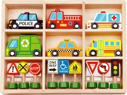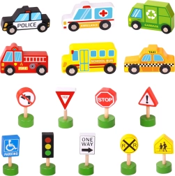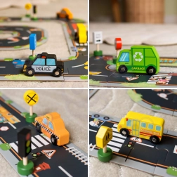 - Contenu du set : ambulance, camion de pompiers, taxi, autobus scolaire, voiture de police, camion-benne, feu tricolore et 8 panneaux de signalisation.