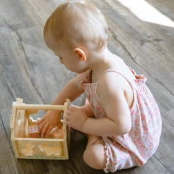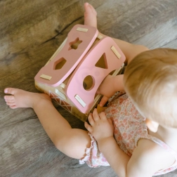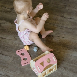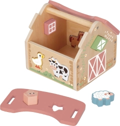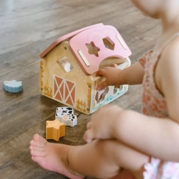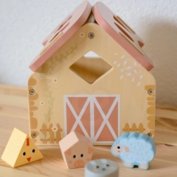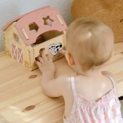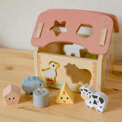 La jolie grange en bois avec des découpes pour les animaux et les formes motive les enfants à un jeu actif et à un apprentissage naturel. En insérant les bonnes pièces, les enfants exercent leur patience, leur concentration et la compréhension de la cause et de l’effet. Le design naturel aux tons pastel s’intègre parfaitement dans la chambre d’enfant.