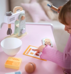 Le mixeur en bois aux tons pastel WOOPIE GREEN est un excellent jouet pour les petits chefs. Il offre 11 pièces, des éléments mobiles comme un vrai robot et favorise la créativité, la motricité fine ainsi que l’apprentissage selon la recette grâce à la carte de recette incluse.