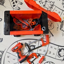 Elle comprend un outil multifonction à piles avec embouts interchangeables, un riche assortiment de vis, d’écrous et de « planches » en plastique pour s’exercer à visser, percer et assembler. Des lunettes de protection et d’autres accessoires utiles sont inclus pour un jeu réaliste mais sûr.