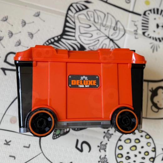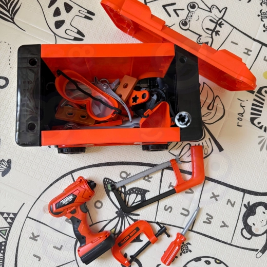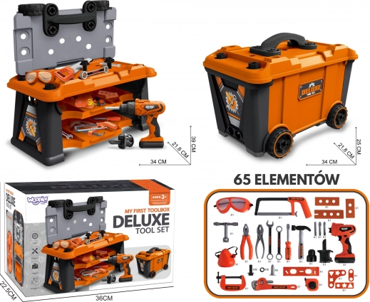 Transformez la chambre d’enfant en un petit atelier avec la valise d’outils mobile 2-en-1 de la marque Woopie. Cet ensemble robuste se convertit facilement d’un atelier de travail en valise à roulettes avec poignée. Il comprend 65 pièces, dont un outil multifonction réaliste à piles (2× AA, non incluses), des lunettes de protection et un riche assortiment d’accessoires pour jeux de rôle créatifs, le développement de la motricité fine et des capacités de coordination.