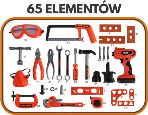 - Lunettes de protection, scie, serre-joint, clés (T, plate-à-œil, à œil, réglable), pince, pince coupante, tournevis, marteau, niveau à bulle, mètre, outil multifonction avec embouts (foret, plat, cruciforme), deux têtes (perceuse/tournevis, scie sauteuse), 3 planches en plastique avec trous, 16 vis, 16 écrous, 6 tire-fonds, 3 gabarits de construction