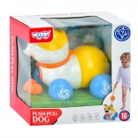 À utiliser comme jouet à pousser avec une longue tige ou comme petit chien à tirer en laisse. Idéal pour développer la marche et la coordination.