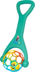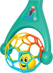 Ce jouet comprend une grande sphère élastique avec des ouvertures pour une prise facile et une poignée turquoise confortable. À l'intérieur de la sphère se trouve une petite boule transparente avec des billes colorées qui produisent des sons en bougeant, amusant ainsi les enfants. La sphère peut être roulée, lancée, écrasée ou, après avoir fixé la poignée, poussée et tirée, la rendant très polyvalente et dynamique.