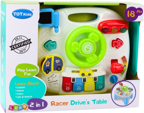 Le panneau comprend de nombreux éléments mobiles et interactifs : un volant avec klaxon, des signaux lumineux, des touches de piano do-ré-mi-fa, un bouton rotatif pour régler le volume, un petit livre avec des images de véhicules, un miroir, un levier de vitesse mobile, une petite voiture et d’autres boutons colorés. En appuyant sur les boutons, l’enfant entend des sons de voiture, des chansons, des mélodies joyeuses et déclenche aussi des effets lumineux.