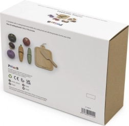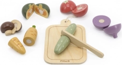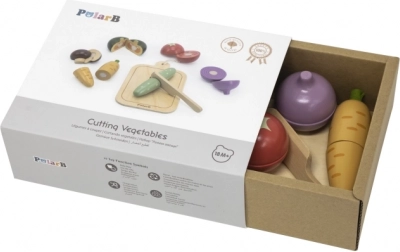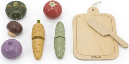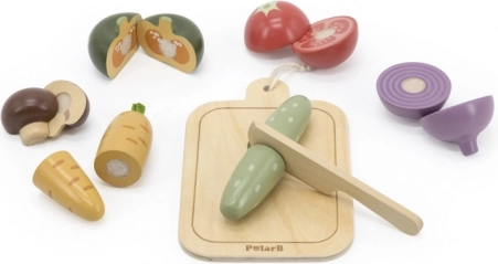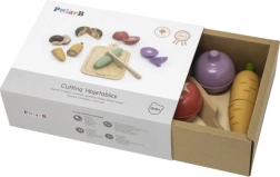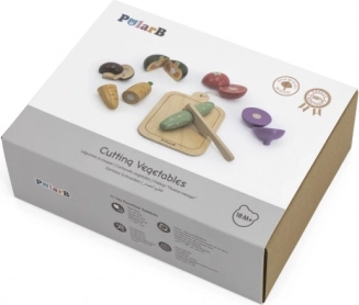 L'ensemble en bois pour couper les légumes offre un moyen amusant et sécurisé d'enseigner aux enfants les légumes. Comprend une planche, un couteau et six types de légumes avec du velcro.