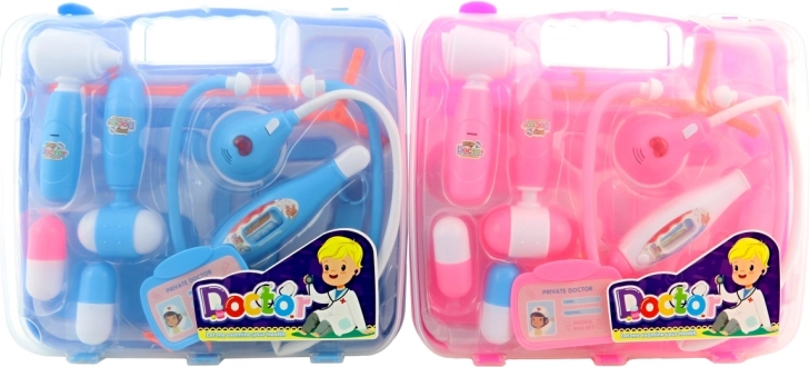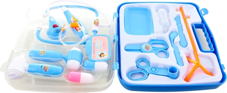 Grande trousse de docteur pour enfants dans une valisette pratique, comprenant divers instruments dont un stéthoscope qui s’illumine et émet des battements de cœur lorsque l’on appuie sur le bouton.