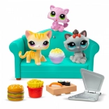 - 3 figurines de chats, canapé, mini ordinateur portable, petite table et accessoires snack (pop-corn, burger, sushi, frites), carte de collection, code virtuel