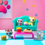 Ce set thématique inclut trois chats stylisés et tout le nécessaire pour un scénario “film & collation” détendu : mini ordinateur portable, petite table et délicieuses gourmandises – frites, sushi, burger et pop-corn. Grâce aux détails colorés et aux accessoires pour s’installer confortablement, les enfants créent facilement leurs propres histoires et décors.