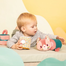 - Rouleau avec poignées et son de froissement pour une prise en main facile et amusante.
