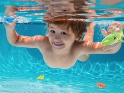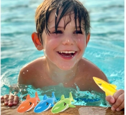 - Plongée pour requins : Jetez les requins dans la piscine ou la pataugeoire. Une fois qu'ils ont coulé au fond, l'enfant doit les récupérer, ce qui lui apprend à plonger et à contrôler sa respiration.