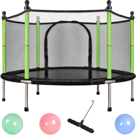 - filet de protection avec entrée à double fermeture éclair, toile de saut, 6 pieds, 6 embouts antidérapants, 6 protections de poteaux, 36 ressorts, 10 balles colorées (Ø 6 cm), notice de montage