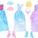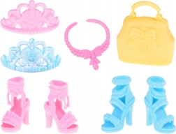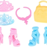 Deux paires élégantes de chaussures à talons ajoutent charme et style à l'apparence générale. Les accessoires, tels qu'un sac à main élégant, un collier rose et deux couronnes sont parfaits pour chaque petite princesse.