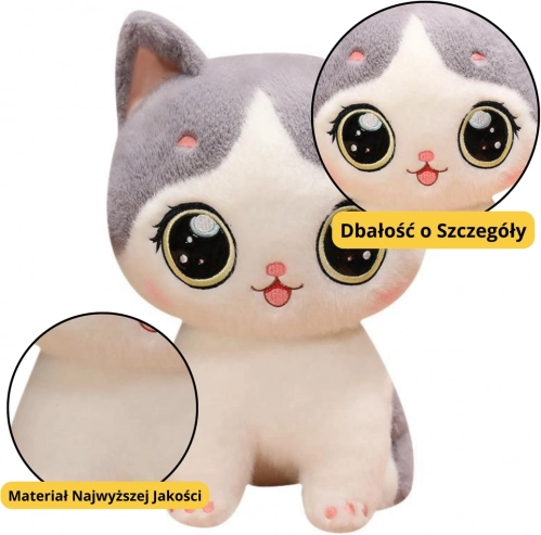 La peluche chat est fabriquée en peluche gris-blanc de haute qualité, avec de grands yeux brillants et un petit museau. Sa forme arrondie, ses détails roses et sa finition soignée la rendent particulièrement mignonne et attachante.