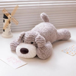 Le chien en peluche a un visage amical avec un grand museau, de longues oreilles tombantes et une queue duveteuse, ce qui lui donne un aspect particulièrement adorable. Il est allongé dans une position confortable et naturelle, les pattes étirées, rappelant un vrai chiot. Cela stimule l’imagination des enfants, les encourage à créer des scénarios et des histoires avec le chien comme héros principal, favorisant ainsi le développement émotionnel et la créativité.