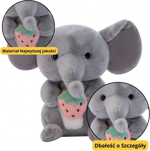 L’éléphant en peluche peut devenir un excellent compagnon pour le jeu quotidien, les déplacements, la maternelle ou un sommeil paisible. Sa taille compacte facilite le transport. L’éléphant a de grandes oreilles, une expression attendrissante et tient une fraise en peluche qui le rend unique.