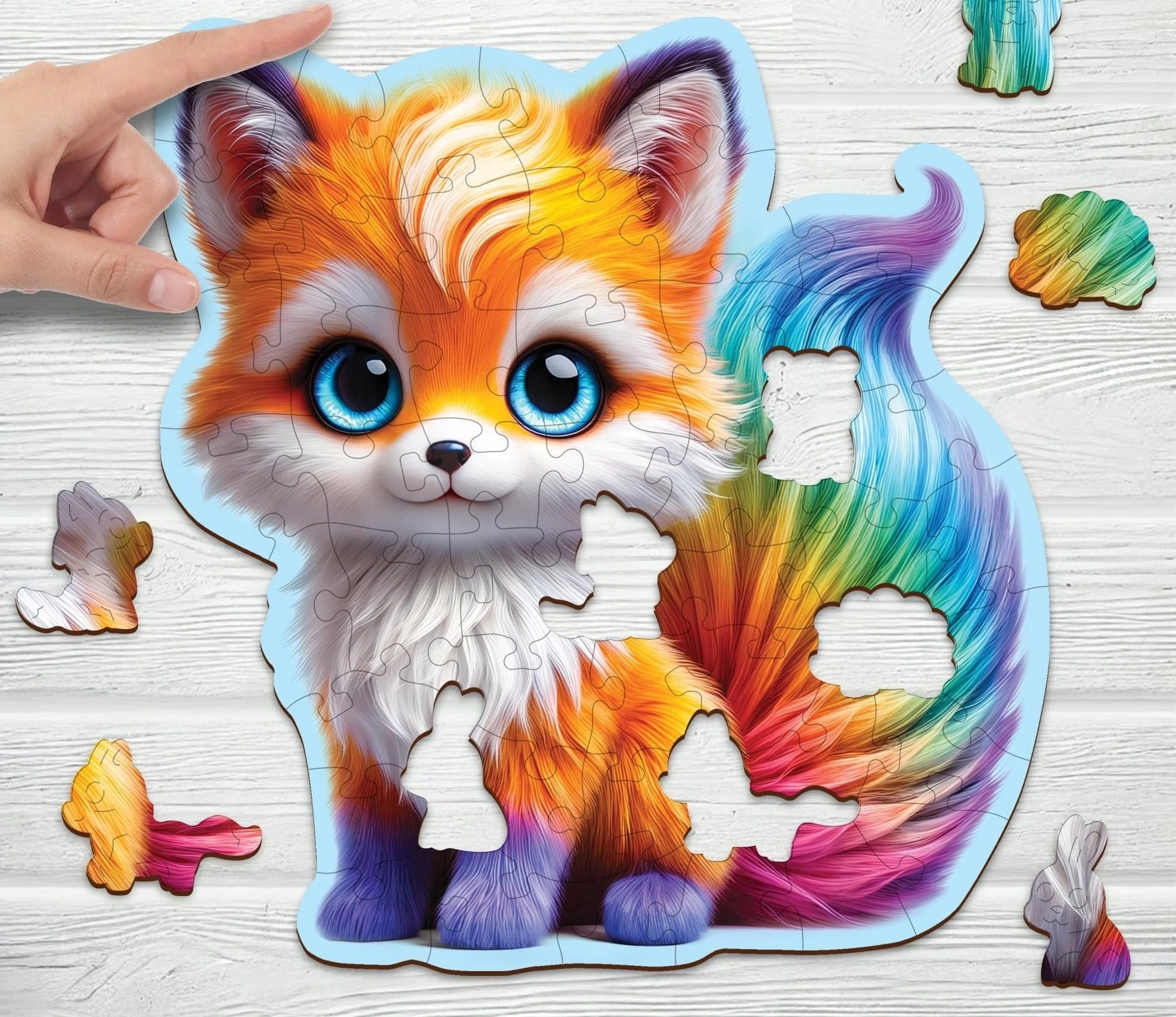 Le puzzle en bois Renard mignon de la marque Wooden City est fabriqué en panneaux de fibres HDF de qualité de 3 à 4 mm d’épaisseur, et les pièces sont découpées au laser avec précision pour des bords lisses sans échardes. L’assemblage de ce puzzle est un véritable défi ludique grâce à ses pièces aux formes uniques, dont certaines imitent des animaux et peuvent tenir comme de petites figurines autonomes.
