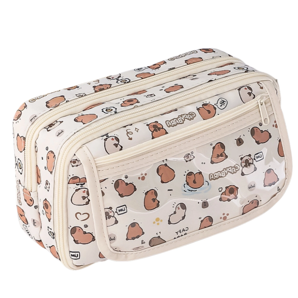 Grande trousse fonctionnelle avec motif de capybaras, idéale pour les élèves qui valorisent la praticité et un design adorable. De couleur crème avec un imprimé de capybaras sympathiques, la trousse se distingue parmi les autres fournitures scolaires. Convient pour l’école, l’université, les cours d’arts plastiques ou le bureau à domicile.