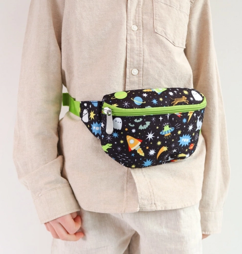 Cette banane bleu foncé à imprimé spatial apporte non seulement de la joie, mais aussi de la praticité. Avec une poche avant suffisamment grande pour le portefeuille et le téléphone portable et une poche arrière zippée pour les petits objets de valeur, cette banane est idéale pour les aventures quotidiennes.