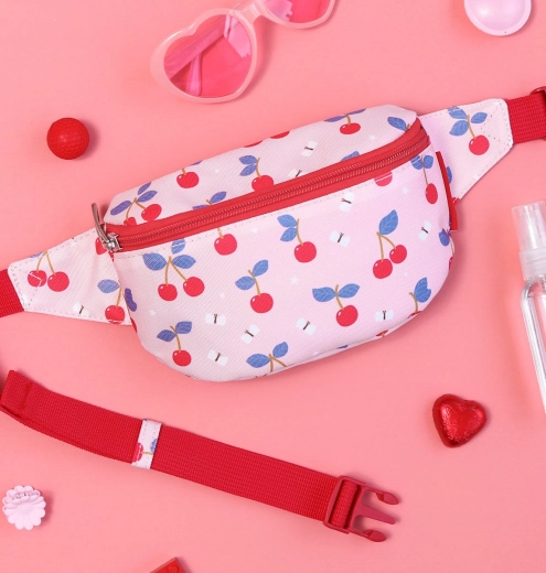 Sac banane rose pour enfant avec motif de cerises, idéal pour les enfants grâce à la sangle ajustable. Peut être porté autour de la taille ou en bandoulière.
