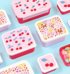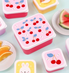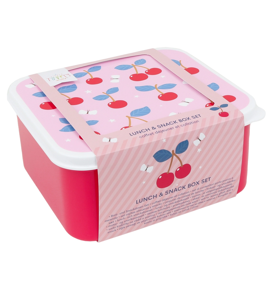 Ce set de boîtes à goûter est idéal pour un usage quotidien grâce à ses quatre tailles différentes, qui s’emboîtent les unes dans les autres pour un rangement pratique. Le motif cerises apporte une touche ludique et conviviale à vos déjeuners et collations. Veuillez noter que ces boîtes ne conviennent pas au lave-vaisselle ni au four micro-ondes. Avant la première utilisation, lavez tous les contenants à l’eau tiède savonneuse.