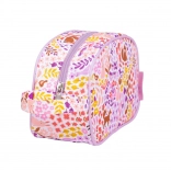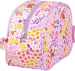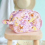 Profitez d'une trousse de toilette violette claire pratique avec une impression animale unique dans un jardin fleuri.