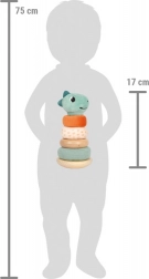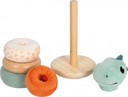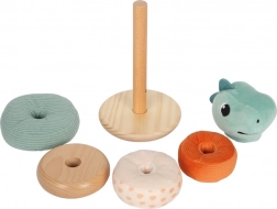 Ce jouet de motricité en forme de tour basculante avec quatre anneaux colorés est idéal pour apprendre à reconnaître les tailles et les couleurs. La tour comprend une tige centrale mobile et sûre ainsi qu’une tête de dinosaure souriante. La base arrondie assure la stabilité, tandis que les différents anneaux en tissu et en bois séduisent par leur design.